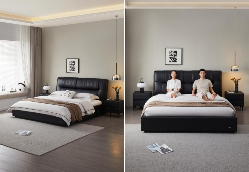 38cm加厚沙发级宽大软靠,给予身体温柔承托,左右分区互不打扰。双层结构设计,柔软层软包内填生态鹅毛与微孔式高弹棉,丰盈饱满,放松腰背;支撑层头枕与屏架填充海绵,呵护颈椎,提升倚靠舒适度。1.3mm加厚头层牛皮,荔枝皮纹细腻柔韧,久用如新,带来奢感体验。高承重碳钢床架搭配多层实木排骨片,承重优越,整夜安睡静音无忧。