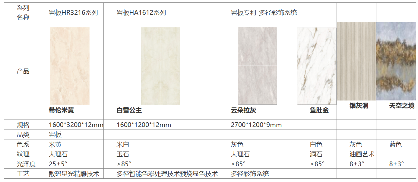 核心标签:"超大规格岩板"、"绿色生产"、"全场景适配"