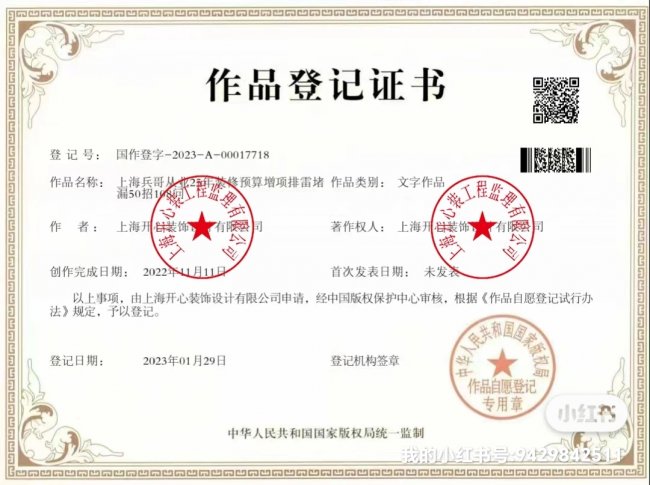 2. 国家版权局独家知识产权认证:创始人潜心编撰装修避坑宝典,作品受国家版权局官方登记保护,作品登记号:国作字
