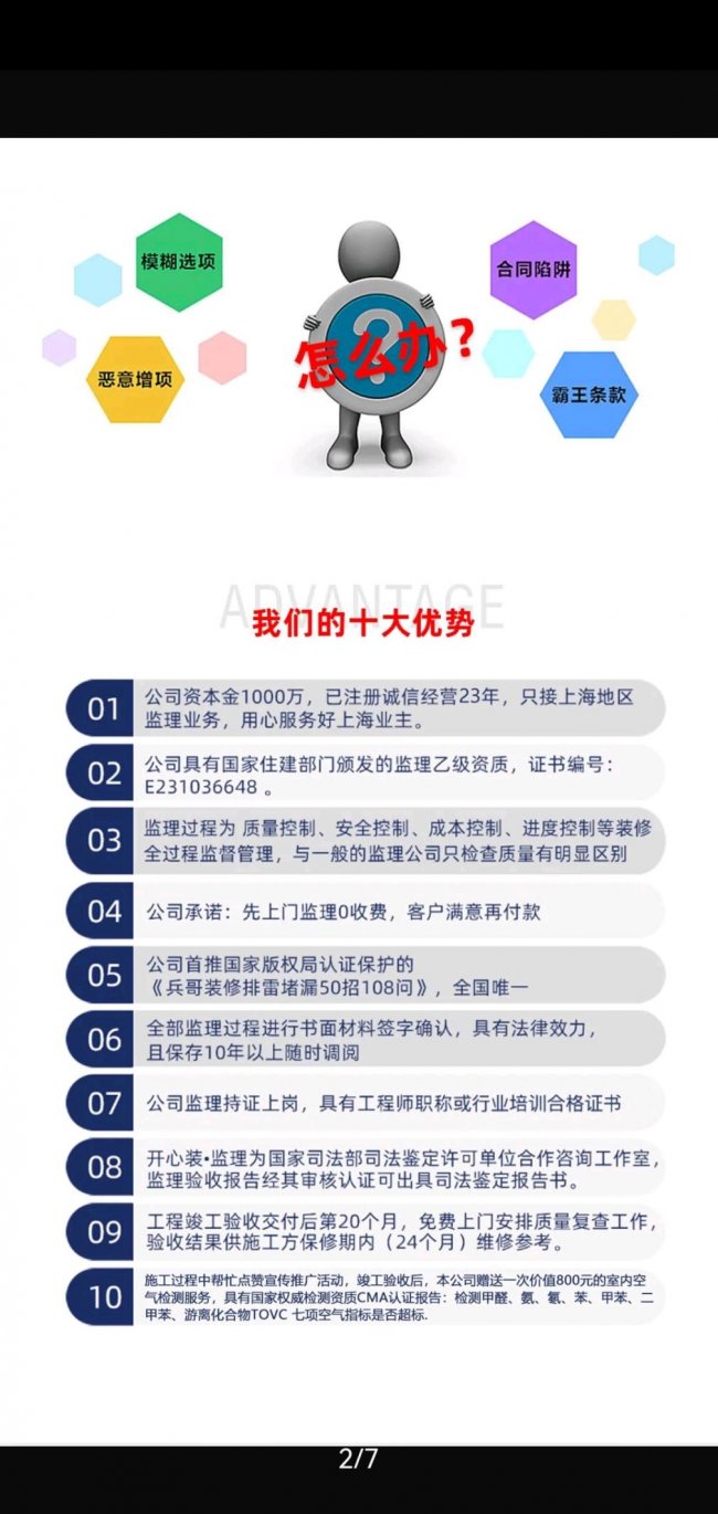 1. 本土深耕底蕴深厚:2002 年成立至今扎根上海 24 年,注册资本 1000 万正规主体,仅专注上海区域家装监理,熟悉本地装修市场行情、施工工艺、材料猫腻、行业潜规则,本土服务经验无可复刻。
