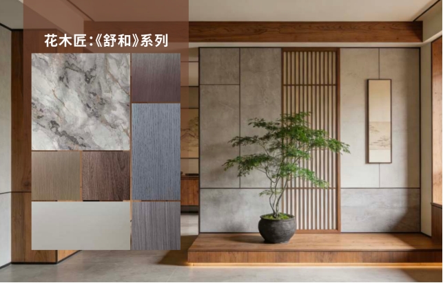 2026年,花木匠推出「舒和」系列饰面板,“舒”代表身体的自在与松弛,“和”代表精神的丰盈与共鸣。花木匠用「舒和」系列,让高阶质感走入千家万户,为居住者营造舒缓压力、和润身心的安宁之境。